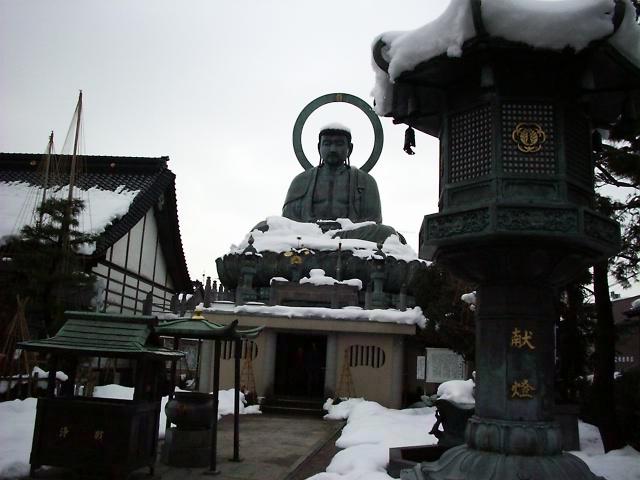 日本三大大仏のひとつで、1745年極楽寺の良観が庶民の平和を祈願して作ったのが始まりである。その後、二度も焼失し、昭和8年に、鋳物の町に相応しい燃えない鋳物製にして再興した。高さ15m越え30年の歳月をかけて作られたもので高岡銅器の技の結晶である。
