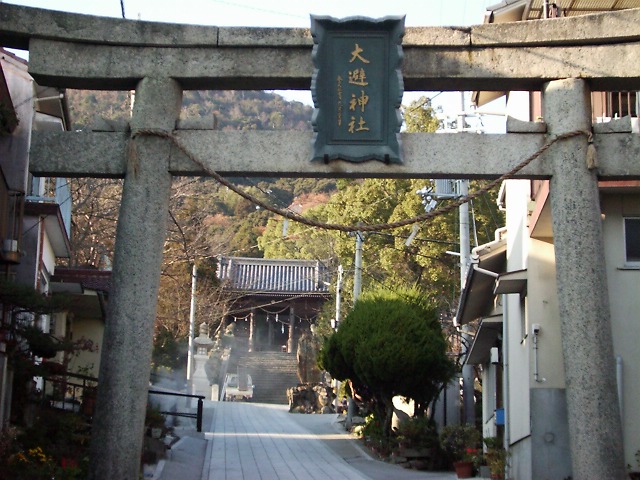 海岸線を東に行くと右手に大避神社の通りが目に入る。石畳を登っていくと大鳥居がある。石段を登ると拝殿・神門がある。この神社の歴史は古く皇極天皇の時代(642〜45)に遡る。秦河勝を祭神としている。春は桜の名所として、秋は毎年10月上旬に行われる「坂越舟祭り」は有名である。