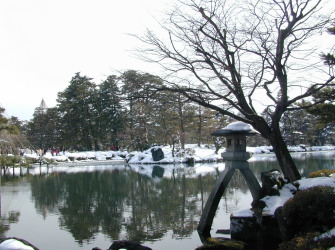 兼六園の冬の風物詩は「雪吊り」である。「雪吊り」は雪の重みで木の枝が折れないように縄で枝を吊り上げたものである。毎年11月1日になると雪づり作業を始める。兼六公園で最も枝ぶりが見事な松は『唐崎松』である。雪の唐崎松は見ごたえがある。13代藩主が琵琶湖湖畔の唐崎が種子を取り寄せて実生から育てた松である。