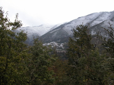 そんな急ではない登り道をゆっくり進む。しばらく登ると時々背後を振り返るとよい。水尾の部落や愛宕山が見えてくる。冬に登ると愛宕山の雪の薄化粧も最高である。木の合間から見える景色を見て、ついついカメラに収めたくなる。登り着いたあとは平坦な道が続く。明智越えは尾根伝いの道であるが平地と間違うほど平坦である。途中幾つかの道と交わるが亀岡を目指して歩く。