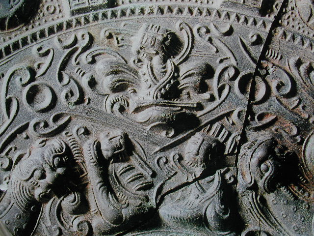 ・・・絵柄の仙人の走る方向が右回り。年号入りの画文帯神獣鏡で一番古いものは中国・後漢時代の永康(えいろ)元年<167>でこの頃から画文帯が始まった。画文帯の文様に仙人が走る姿が浮き彫りになっているが、当初は左回りであった。右回りは後漢の末期のもので、3世紀の初めのものと思われる。