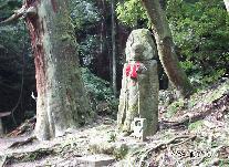荒木又右衛門が試し切りしたという伝説がある地蔵さんで首の辺りで別れている。林の中に立っているせいか苔で覆われている。この辺りから期待の滝坂道に入る。近くの新池かこの地蔵辺りと一休みするとよい。
