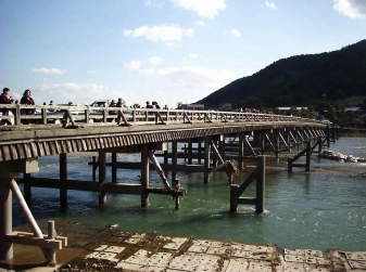 京都を代表する観光名所・嵐山には欠かせないのが渡月橋である。保津川が大堰川そして桂川と名を変え、平安の貴族が舟遊びや紅葉狩りを楽しんだところである。本流に架かる大橋は長さ155m幅11mあり、中島を挟んで対岸との間にかかる小橋は、長さ19m幅11mある。一般には大橋を渡月橋と呼ぶ。嵐山を借景にしたこの景色は四季折々の美しさを繰り広げる。平安初期の貞観16年、南畔にあった葛井寺が法輪寺と改名されてからは、この橋は法輪寺橋と呼ばれていた。その後、鎌倉時代に亀山上皇が丹朱を塗った美しい橋の姿を見て、「満月の渡るに似たり・・・」といった事から、渡月橋と名づけられた。近くには名所が多く、嵯峨野・嵐山めぐりがよい。