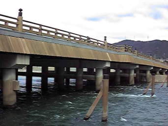 鴨川に架かる橋で、長さ65m幅35mあり花崗岩の高欄がある。「京の五条の橋の上、牛若丸と弁慶は・・・・」童謡に出て来る京都五条大橋は馴染み深い。昔は平安京の五条大橋に架かっていたものを、豊臣秀吉が天正年間に下流の六条坊門小路(今の五条)に付け替えた。当時の五条通りは、今の松原通りに相当する。伝説によると、雅やかな春の夜に風雅に笛を吹いて現れた牛若丸と、名刀コレクション千本を目指す弁慶の出会いの場所である。「義経記」や謡曲「橋弁慶」に紹介されている。今でも橋の西側の緑地帯に牛若丸と弁慶の像がある。