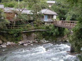 湯ヶ野の温泉はそれなりの規模であり、川を挟んで温泉宿が並んでいる。川沿いに下駄を履いて散歩すると温泉情緒をたっぷり味わえる。昔は旅芸人の踊りを酒の肴にして、芸者の踊りを・・・そんな面影が今も残る温泉街である。